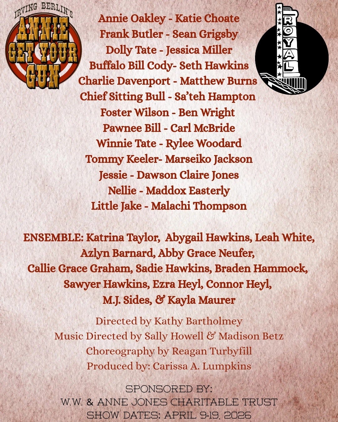 The Royal Players in Benton have announced a massive, talented cast for their April 9–19 production of Annie Get Your Gun.