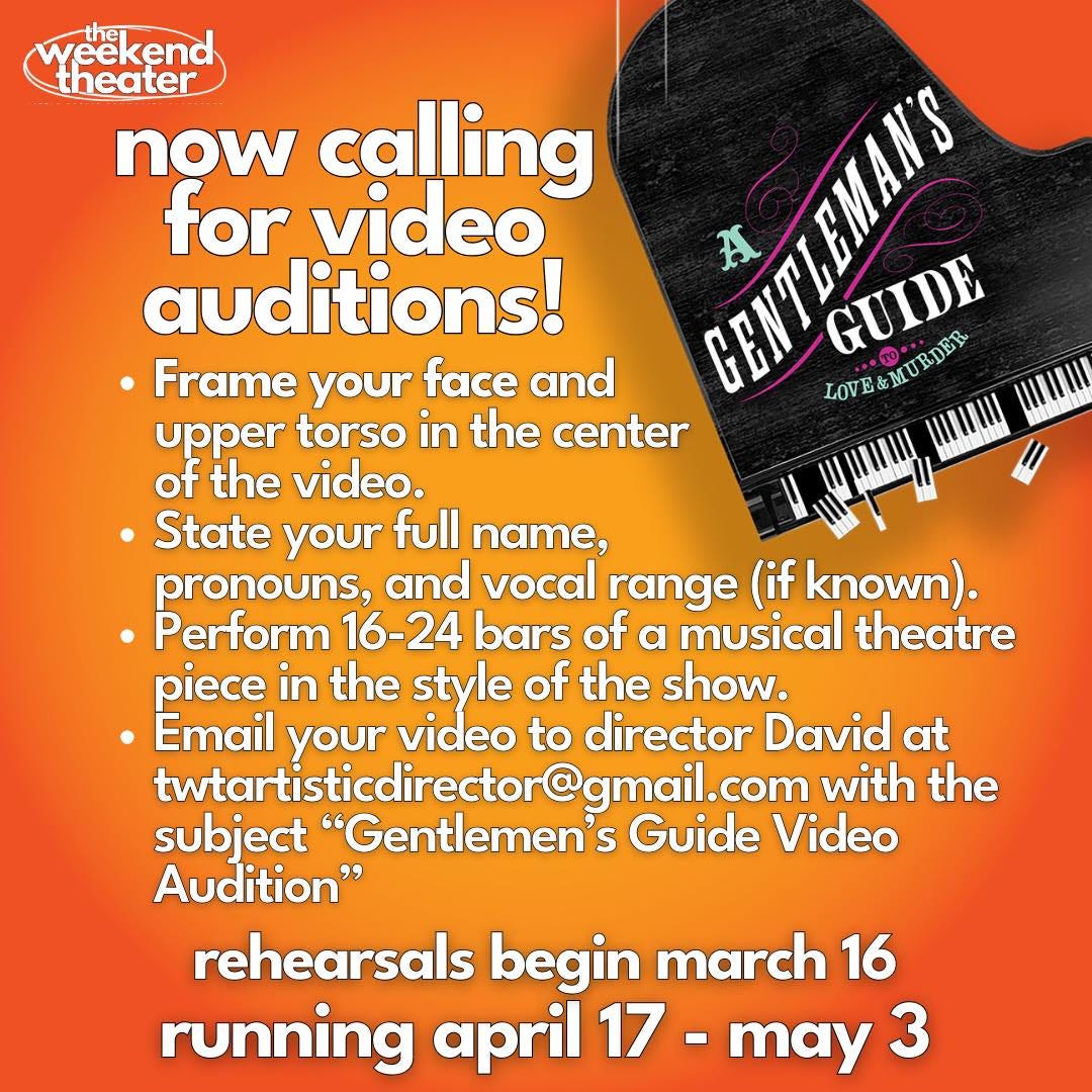 The Weekend Theater is officially on the hunt for a cast that can pull off a little “musical-comedy-murder-non-mystery.” They are currently accepting video auditions for all roles in A Gentleman’s Guide to Love and Murder. Follow Monty Navarro, a low-born man who discovers he is eighth in line for an earldom and decides to “eliminate” the D’Ysquith family members standing in his way. This ghoulish path to the Earldom of Highhurst is packed with lightning-fast character changes and hilarious musical numbers. Parts are available for all ethnicities and gender expressions.